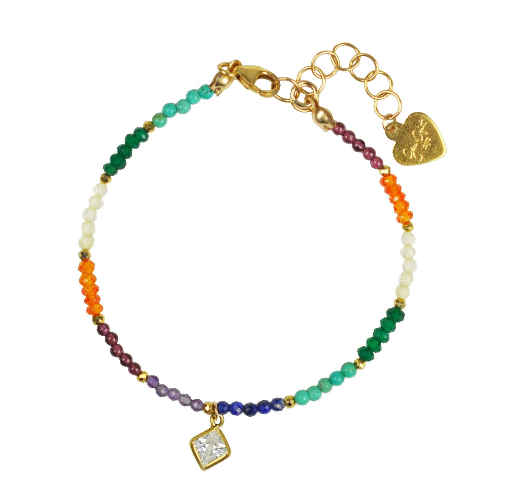 Each color of the chakra rainbow is linked to one of your chakras. Garnet for Red is linked to the Root chakra, Carnelian for Orange is linked to the Sacral chakra, Citrine for Yellow is linked to the Solar Plexus chakra, Aventurine for Green is linked to the Heart Chakra, Turquoise for Light Blue is linked to the Throat chakra, Lapis Lazuli for Dark Blue is linked to the Third Eye chakra, and Amethyst for Purple is linked to the Crown chakra.