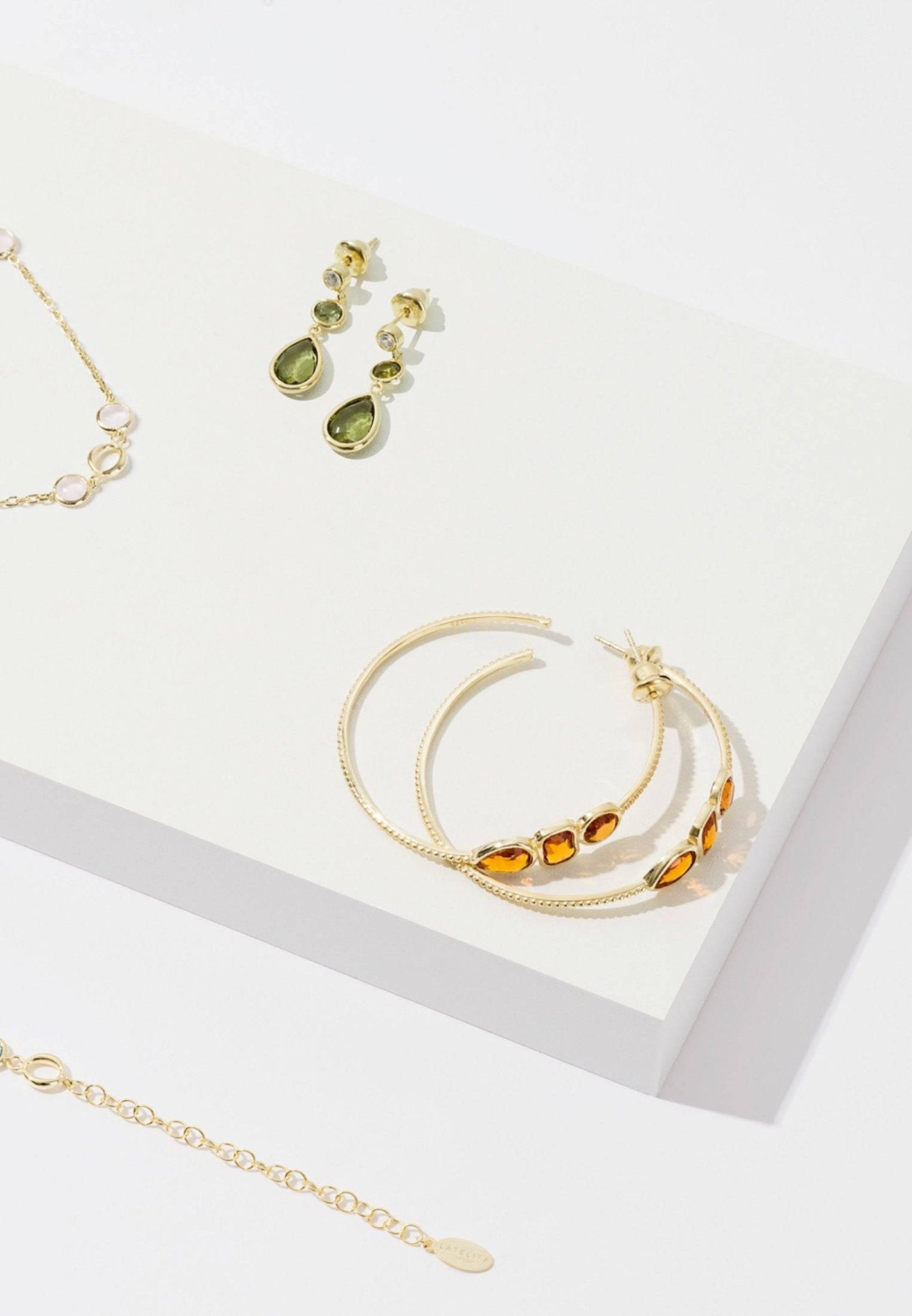 Elevate your appearance with the glamorous Tuscany Gemstone Drop Earring. This captivating earring includes a small, glittering cz top paired with two exquisite gemstones, one circular and one teardrop-shaped, to add dazzling movement.